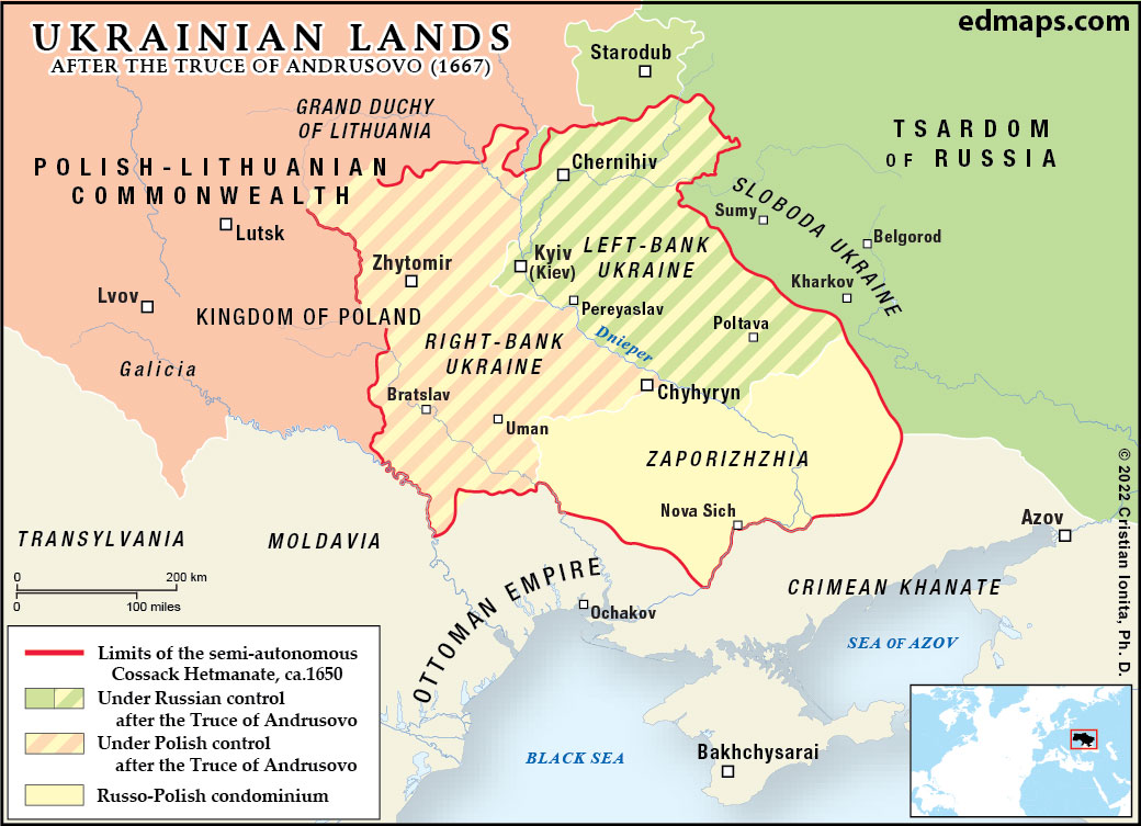 The Truce of Andrusovo in 1667 fundamentally partitioned Ukrainian territories, ending the Russo-Polish War and establishing a division that would shape Ukrainian history for centuries. This agreement formalized the Cossack Hetmanate's split, with Left Bank Ukraine (east of the Dnieper River) and Kyiv falling under Russian control, while Right Bank Ukraine remained under Polish sovereignty. This partition created two distinct Ukrainian experiences, despite shared cultural and linguistic heritage.