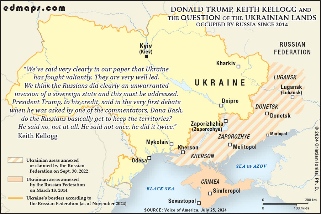 Under Kellogg's framework, Ukraine would not be asked to give up its ambition to regain all land seized by Russia, but Kyiv should agree to use diplomatic means only and realize that it might take a long time to regain all of the territories. This formulation allowed Ukraine to maintain its territorial claims without formally recognizing Russian annexations, while acknowledging the practical reality that military reconquest might be infeasible.
